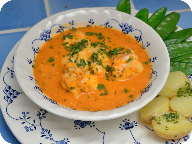 - Déglacez les sucs de cuisson de la lotte avec la sauce. Montez à nouveau à température, petit bouillon. Versez la lotte et son jus. Mélangez bien. Réduisez le feu au strict minimum. Couvrez et POCHEZ la lotte 10 à 15 minutes – PAS PLUS ! – il ne faut pas cuire plus la lotte à feu moyen/fort car elle deviendrait caoutchouteuse.